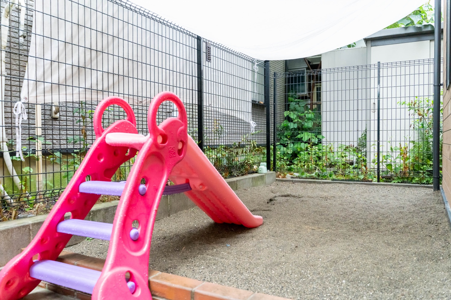 園庭はないのですが、芝生のスペースがあります。小さい子たちが水遊びをすることもできるんですよ。時にはここで絵の具を使った製作をすることもあります。