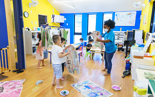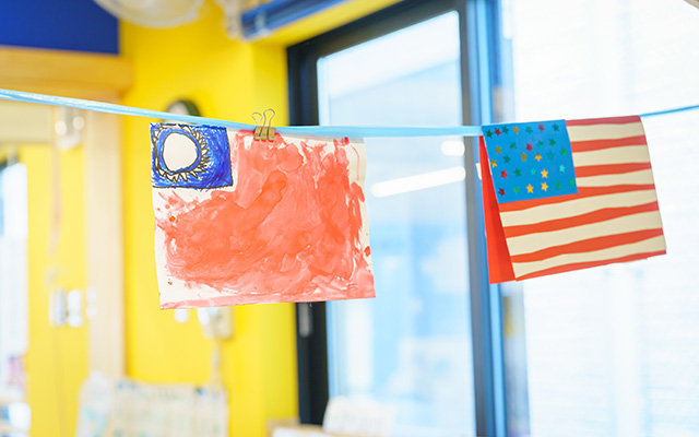 ILHでは「イングリッシュ・タイム」という時間を毎日の主活動に設定していますが、朝の会から始まってクラフトの時間、戸外活動や給食、午睡、おやつ、そして自由遊びからお迎えまで、常に英語に自然に触れられる環境になっています。