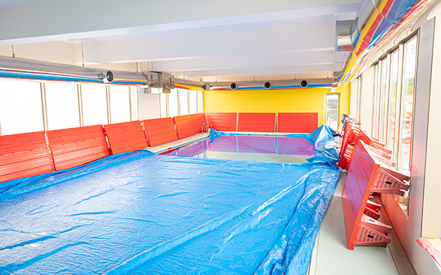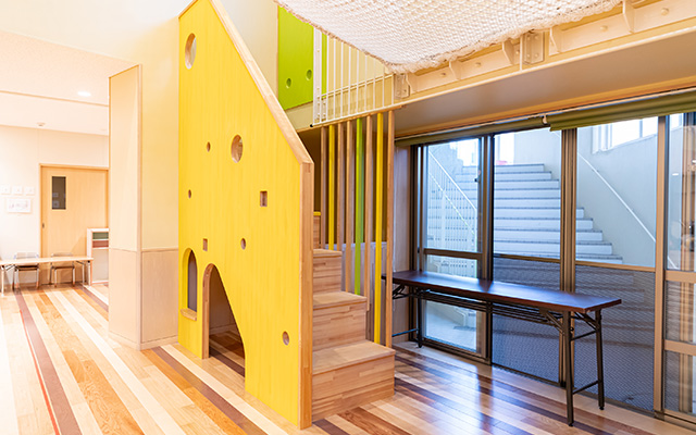 幼稚園棟には、年少・年中・年長の広々とした保育室があり長い廊下とテラス、それぞれの部屋ははしごや階段でつながっており、子どもたちが自由に行き来できるようになっています。各保育室には絵本が50冊以上、アトリエや図書館もあるんですよ。天井に大きなネット遊具のあるホールも大人気です。