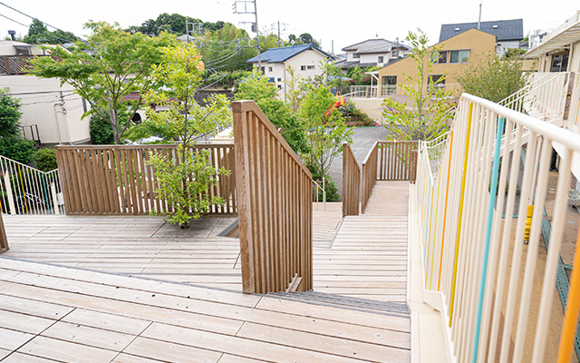 新園舎は著名な建築家に依頼して設計していただきました。子どもも大人も毎日通いたくなる、遊び心満載の園舎になっています。園庭も思いっきり走り回ることができる広さと、大きな遊具が配置され、四季折々の草木が子どもの手の届くところに植えられています。子どもたちの目の高さに様々な植物の実や花があります。子ども自身が「この木にはこんな花が咲いて、こんな実がなるんだね!」と観察できるようになっているんですよ。