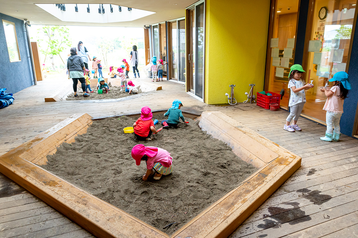 「これは完全に、子どもたちが遊びたくなるデザインですよね笑。水場があると遊びたくなるのは子どもの自然な姿です。部屋の真ん中に遊び心を加えてみました。普通手洗い場は部屋の端っこにあるものだと思うんです。でもそれは既成概念。保育室も完全な四角形ではなく、それぞれ不思議な多角形になっています。多角形が集まっている姿は、異なる考えや価値観を持つ個人が集まって物事を共有し、生み出していく情報社会を表しています。空間そのものが多様性や柔軟性を表しているんです」と西原代表。園庭と園舎の境目があいまいなのも、あえてあいまいな遊びを生み出すというねらいがあるそうです。