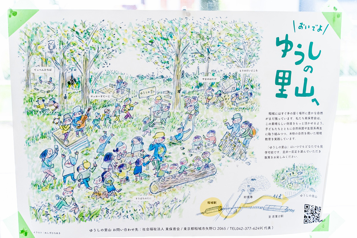 そして、2020年5月、稲城市内の山林の一部を法人で所有し「ゆうしの里山」と名付け、自然教育の拠点として、地域の方々やNPO法人の皆さんの協力も得ながら維持・管理しています。稲城市内の里山は、人の手をかけないと管理が難しく、地主さんの高齢化や所有者による放置などの理由で荒廃が進んでいる状況でした。かつてのような美しく豊かな生態系を持つ肥沃な里山を守り育てることこそ、子どもたちそして地域の未来をつくることではないか、そんな想いで、里山を買い取り整備・管理活動を行うことにしたのです。