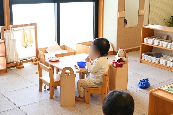子どもが座位をとれるようになるまでは、担当の保育士が1対1で抱っこで食事をします。座位が安定してきてお座りできるようになると、椅子に座って食事をします。だんだんスプーンで食べることが上手になってきたら 1対2に。0歳児から1歳児クラスに移行するときに食べ方、手の動きなども担任から丁寧に引き継ぎます。2歳になる頃には、こぼさずに食べられるようになってくるので、エプロンも子どもによっては着けなくなります。