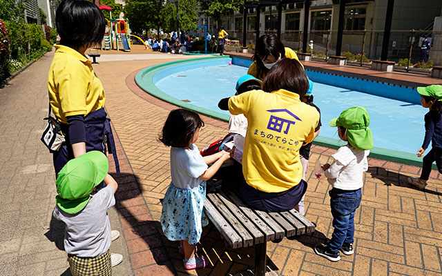 豊かな下町情緒が残る東京・中央区人形町の街並みに、ひと際目を引く黄色と青色ののれんが個性的な「まちのてらこや保育園」。1クラス6人、合計30人の小規模な認可保育園です。公立保育園で長年保育経験を持ち、現役の保育作家としても雑誌などで活躍中の近藤みさき園長に、保育そして園への思いを語っていただきました。併せて、創立者で理事長の高原友美さん、建築士の石嶋寿和さんにもお話を伺いました。